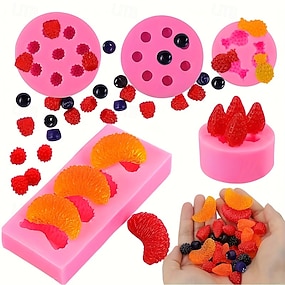 růžové silikonové formy na ovoce 5dílná sada růžových silikonových forem na ovoce - na zdobení svíček, DIY projekty, dekorace - tvary pomeranče, jahody, borůvky, maliny, ananasu
