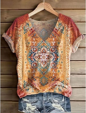 Dámské Tričko Tisk Květinový Grafika Geometrický Vinobraní stylové Na běžné nošení Krátký rukáv Do V Běžné topy Denní Víkend Vodní modrá Rubínově červená Oranžová Léto Jaro