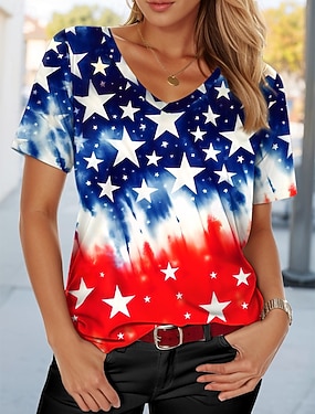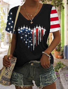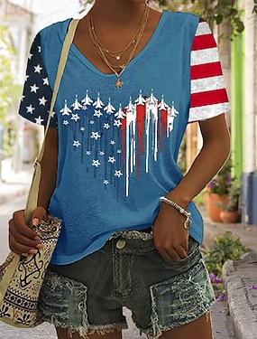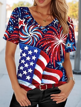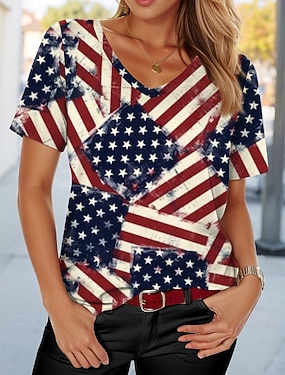 Americký den nezávislosti Dámské Tričko Tisk Grafika Vlajka Vinobraní stylové Klasické Krátký rukáv Do V Běžné topy Denní Vodní modrá Černá Bílá Léto Jaro