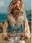 Dámská boho blůza jako len prodyšná lehká květinová grafika elegantní bohémská vintage dlouhý rukáv výstřih do V běžné topy každodenní prázdninová patchwork knoflíky tisk modrá bílá růžová světle