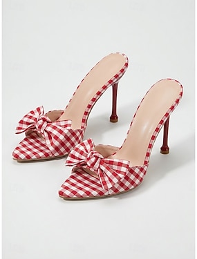 Dámské elegantní červenobílé ginghamové pantofle na vysokém podpatku - elegantní sandály se špičatou špičkou a mašlí &jehlové podpatky na letní večeře v resortech a retro zahradní párty &piknikově