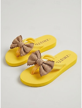 Dámské zářivě žluté žabky s hnědou mašlí na dovolenou na pláži, odpočinek u bazénu a letní prázdniny