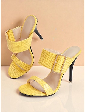 Dámské žluté sandály na vysokém podpatku s krokodýlím vzorem a přezkou - výrazné párty boty s otevřenou špičkou pro noční život, kluby a letní akce