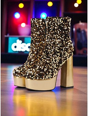 Dámské kotníkové boty na platformě s flitrovanými zlatými vzory ve stylu 80. let – retro disco robustní boty na vysokém podpatku na jevištní představení, do nočních klubů a na kostýmní večírky