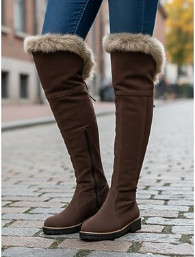 dámské hnědé boty z umělého semiše nad kolena s lemem z umělé kožešiny – útulná a stylová zimní obuv pro extra teplo