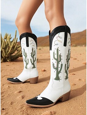 Dámské kovbojské boty westernového stylu s výšivkou kaktusu, špičatou špičkou a robustním podpatkem pro rodea a westernové festivaly