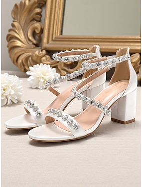 Dámské bílé sandály s kamínky na podpatku - elegantní boty s otevřenou špičkou a páskem přes kotník na koktejlové večírky a formální akce