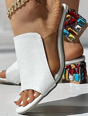 dámské bílé sandály s otevřenou špičkou s reliéfem croc – elegantní nazouvací blokové podpatky s barevným zdobením kamínky na párty a letní nošení