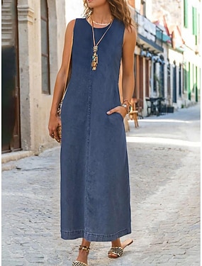 Dámské Džínové šaty Úpletové šaty Maxi dlouhé šaty Džínovina Moderní Na běžné nošení Dovolená Tričkový Slátanina Bez rukávů Léto Jaro 2023 Běžný Černá Královská modř Vodní modrá Čistá barva S M L XL