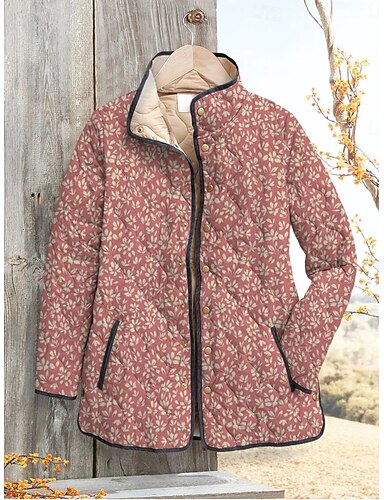 Dámské Zimní bunda Prošívaná bunda Zahřívací Lehká váha Knoflíky Tisk Aktivní Vinobraní umělecké Na běžné nošení S lístky Ležérní Standardní Stojáček Běžný Dlouhý rukáv Svrchní oděvy Oranžová Podzim