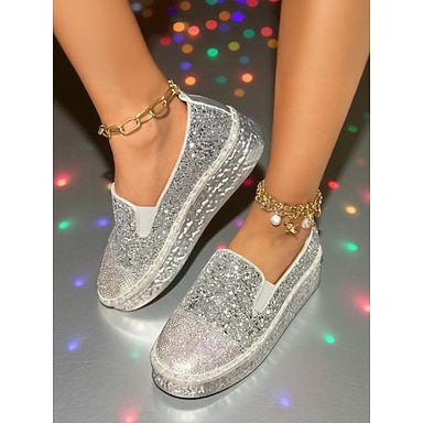 Dámské stříbrné třpytivé tenisky na platformě s nazouváním - třpytivé kamínkové ležérní boty pro noční život, večírky a klubové outfity
