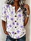 Womenská trička Květinové grafické elegantní 3/4 délka rukáv kulatý výstřih standardní topy každodenní vycházky ruffle knoflíky modrá fialová zelená khaki léto jaro