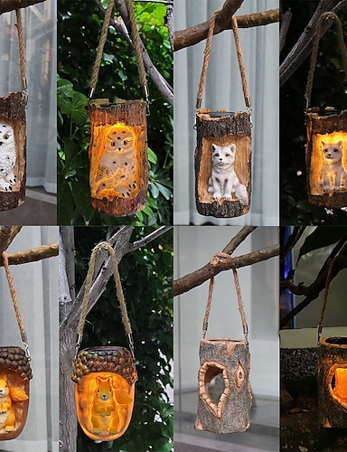 Venkovní solární vodotěsné pryskyřičné závěsné lucerny s motivem pařezu – sova, liška, veverka, díra ve stromu, Santa Claus, dekorativní LED světla do zahrady, na dvůr, na trávník, na cestu, na terasu