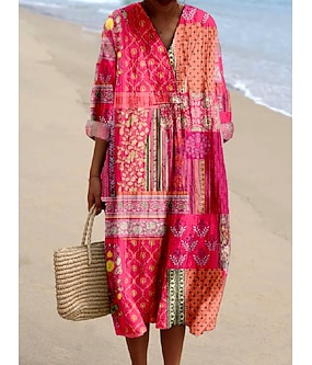 Dámské midi šaty s véčkovým výstřihem dlouhým rukávem kaftan lehké volné áčkové šaty casual boho na ven grafické dlouhý rukáv véčkový výstřih žlutá růžová modrá hnědá