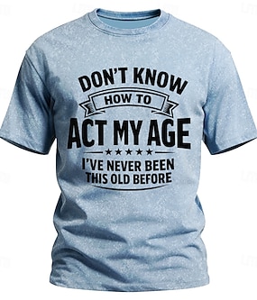 Pánské oblečení, které se neumí chovat, v mém věku nikdy předtím nebyl tak starý, slogan, vtipné, humorné, acid wash, vintage, streetwear, tričko s grafikou, krátký rukáv, denní nošení, značkové