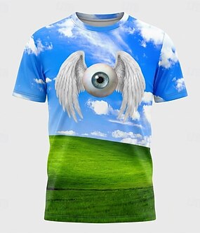 Pánské tričko Dreamcore s andělskými křídly, oční bulvou, 3D grafický potisk, surrealistický design nebe a zeleného kopce, weirdcore estetické tričko, oblečení, velikosti S, M, L, XL, XXL, XXXL