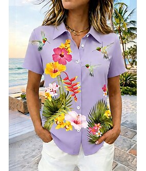 Dámské Košile Květinový Grafika Ptáček Vinobraní Tropický vzhled stylové Krátký rukáv Košilový límec Běžné topy Denní Vodní modrá Fialová Trávová zelená Béžová Léto Jaro