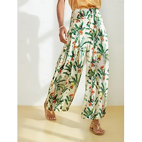 Dámské Široké kalhoty Plná délka Satén Široké nohavice Tisk Lehce elastické prázdniny Kalhoty Dovolená Trávová zelená Jaro léto S M L