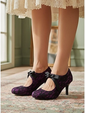 Dámské vintage tmavě fialové krajkové podpatky z 50. let - elegantní tmavě fialové květinové krajkové lodičky se saténovou mašlí &křížené ramínka na retro plesy a večerní galavečery &svatby