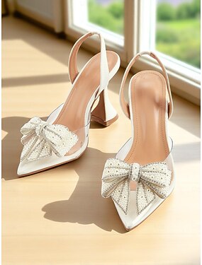 Dámské bílé boty na vysokém podpatku s perleťovou mašlí - průhledné lodičky se špičatou špičkou pro romantické rande nebo elegantní denní outfity