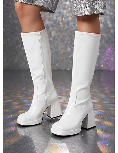 Dámské ikonické disco červené gogo kozačky ze 70. let - lesklé lakované kozačky na platformě do půli lýtek s robustním podpatkem na retro párty a go-go tanec &vintage móda
