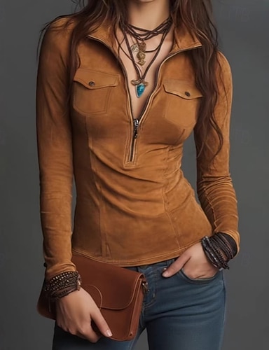 Dámské Košile Halenka Zip Bez vzoru Klasické Retro Moderní Dlouhý rukáv Stojáček Běžné topy Denní Dovolená Jdeme ven Armádní zelená Světle hnědá Hnědá Léto Jaro