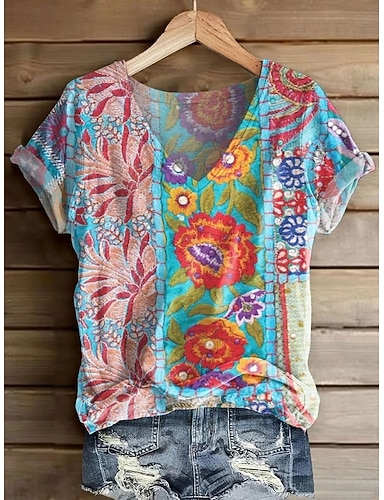 Dámské Tričko Tisk Květinový Grafika Rostliny Vinobraní stylové Na běžné nošení Krátký rukáv Do V Běžné topy Denní Víkend Vodní modrá Žlutá Fialová Fialová Oranžová Léto Jaro