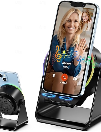 Bezdrátový indukční reproduktor se stojánkem na telefon, přenosný stereo zesilovač otočný o 360 stupňů, RGB světlo, bezdrátové připojení 5.3, ideální pro muže, ženy, teenagery, kuchyň a koupelnu