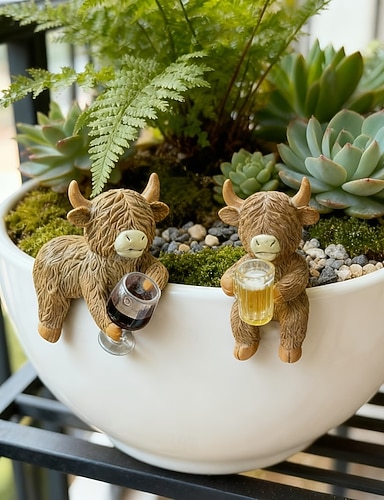Figurky z pryskyřice skotské krávy s pitím, roztomilé doplňky k květináčům, soška pryskyřičné žáby, ideální pro zdobení květináčů, zahrad, akvárií a teras.