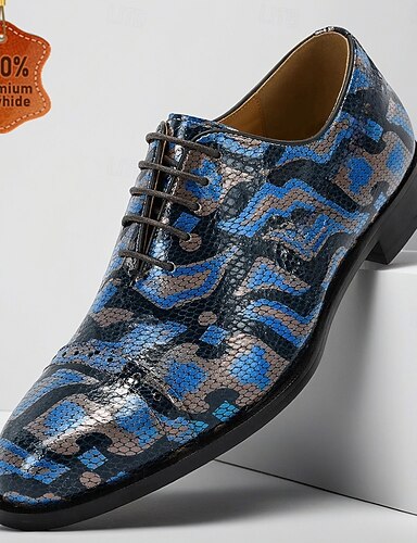 Pánské modré oxfordky s abstraktním vzorem, šněrovací společenské boty, stylová výrazná obuv pro svatební hosty, bankety, večírky, maturitní plesy a formální příležitosti.