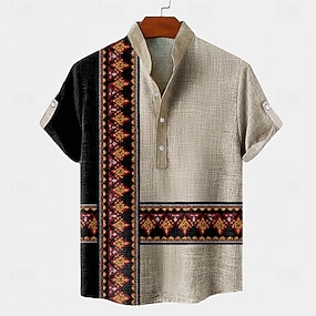 Pánské Geometriské vzory Geleneksel Košile Košile s knoflíkem Krátký rukáv Vintage Retro Dovolená Běžné / Denní Léto Jaro Stojáček Henley Collar 3D tisk Len jako košile Σκούρο Χακί Trávová zelen