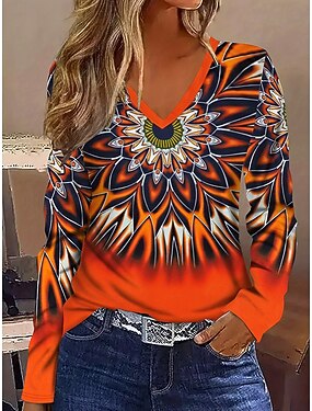 Dámské Tričko Tisk Tónované Grafika Geometrický Vinobraní stylové Na běžné nošení Dlouhý rukáv Do V Běžné topy Denní Vodní modrá Žlutá Oranžová Jaro Podzim