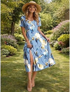 Dámské Midi šaty Áčkové šaty Na běžné nošení Denní Volný Květinový Krátký rukáv Do V Vodní modrá Žlutá Trávová zelená Léto Jaro