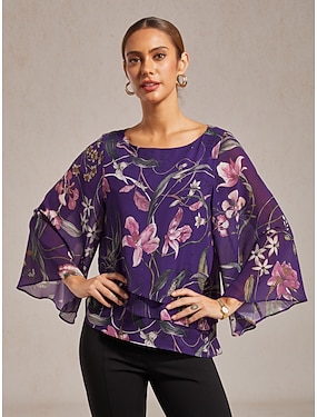 Dámská halenka z průsvitného šifonu, tmavě fialový květinový vzor, poloviční rukáv, vrstvený lem, kulatý výstřih