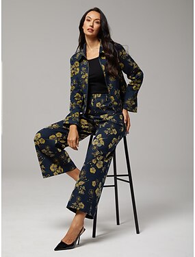 saténové kalhoty s geometrickým květinovým potiskem a širokými nohavicemi pro volný čas
