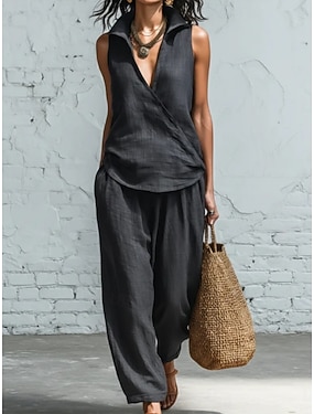 Dámské Sady kalhot Imitace bavlny a lnu Bez rukávů Do V Bez vzoru Módní Šik ven Ležérní Denní Venkovní Vodní modrá Černá Bílá Léto Volný