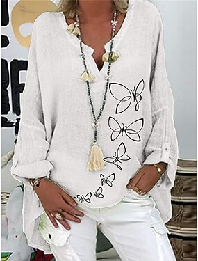 Dámské Bavlněné lněné košile Imitace bavlny a lnu Tisk Motýl Základní Na běžné nošení Dlouhý rukáv Košilový límec Běžné topy Denní Bílá Světlá růžová Námořnická modř Fialová Trávová zelená Léto Podzim