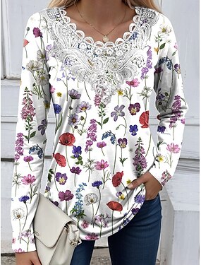 Dámská blůza Tunika Krajková splicing V výstřih Dlouhý rukáv Květinový Grafický rostliny Vintage Klasické Crew Neck Topy Každodenní venkovní víkendový krajkový patchwork potisk Bílá Růžová Fialová