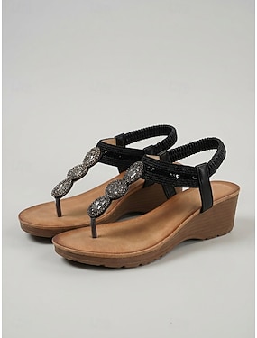 Dámské černé bohémské sandály s kamínky - pohodlné žabky na klínku s flitrovanými pásky na dovolenou na pláži, letní plavby &venkovní resorty