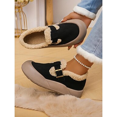 Dámské široké nazouvací boty z červené imitace semiše s teplou plyšovou podšívkou a detailem přezky, útulná zimní obuv do interiéru &outdoorové oblečení