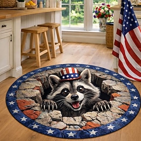 Kulatý koberec s mývalem k 250. výročí USA, 2D plochý tisk, 3D vizuální iluze, nosí klobouk USA, proráží hvězdno-kamenný okraj, perfektní bytová dekorace