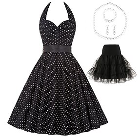 Ženské A-line rockabilly šaty puntíky swing šaty rozšířené šaty s doplňky oblečení Grease z 50. let 60s retro vintage s čelenkou šifonovým šátkem náušnicemi perlou necklace rukavicemi