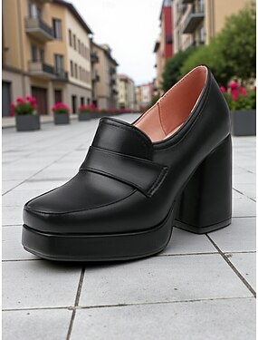 Dámské černé mokasíny na platformě - retro boty s robustním blokovým podpatkem vhodné do kanceláře, do pouličního stylu a do vintage stylu.