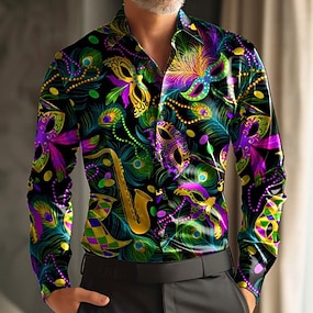 Mardi Gras Pánské Barevná Karneval Maska s peřím Košile Saténová košile Košile k obleku Dlouhý rukáv Móda pro volný čas Párty Dovolená Léto Jaro Přehnutý 3D tisk Košile na knoflíky Černá Fialov