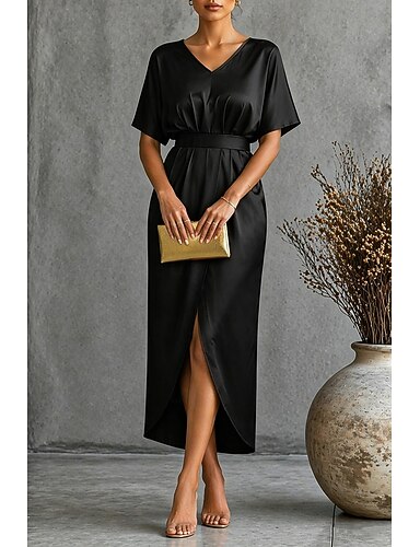 Dámské Midi šaty Saténové šaty Šaty na párty Koktejlky Elegantní Moderní Večerní oslava Párty Běžný Bez vzoru Krátký rukáv Do V Černá Žlutá Námořnická modř Tmavě zelená Jaro Podzim Zima