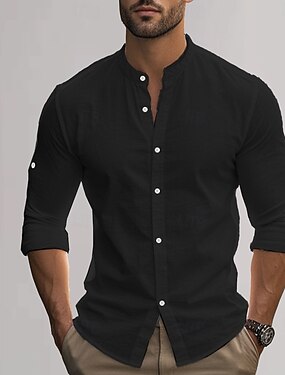 Pánské Bavlněná lněná košile Bez vzoru Dovolená Černá Bílá Khaki Tmavě šedá Dlouhý rukáv límec dědečka Oblečení