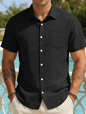 Bavlna a len Klasika Pánské Košile plátěná košile Letní košile Plážová košile Košile na knoflíky Černá Bílá Vodní modrá Krátký rukáv Bez vzoru Přehnutý Léto Dovolená Denní nošení Oblečení