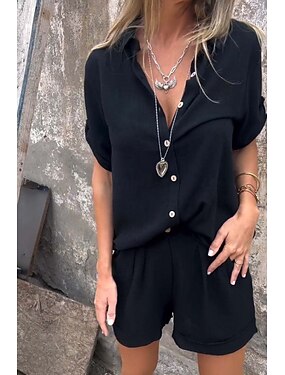Dámské Soupravy šortek Imitace bavlny a lnu Poloviční rukáv Košilový límec Pevná barva Elegantní Módní Šik ven Ležérní Denní Venkovní Vodní modrá Černá Bílá Léto Běžný