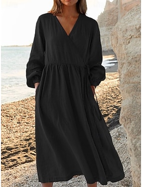 Dámské Midi šaty Imitace bavlny a lnu Áčkové šaty Na běžné nošení Denní Volný Bez vzoru Dlouhý rukáv Do V Vodní modrá Černá Bílá Žlutá Léto Jaro Podzim