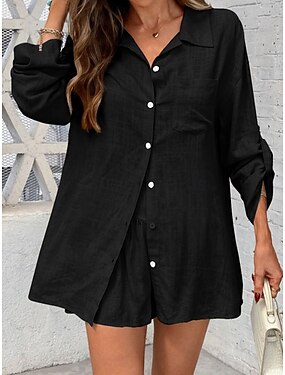 Dámské Dvoudílné sady Bavlněná košile Soupravy šortek Dlouhý rukáv Košilový límec Bez vzoru Módní Šik ven Ležérní Denní Venkovní Černá Námořnická modř Oranžová Léto Běžný